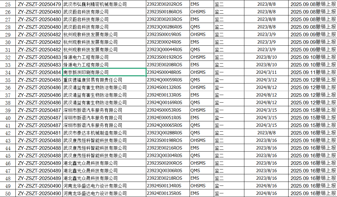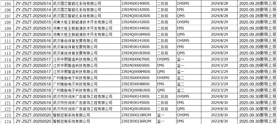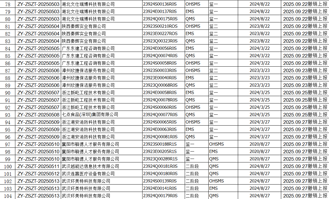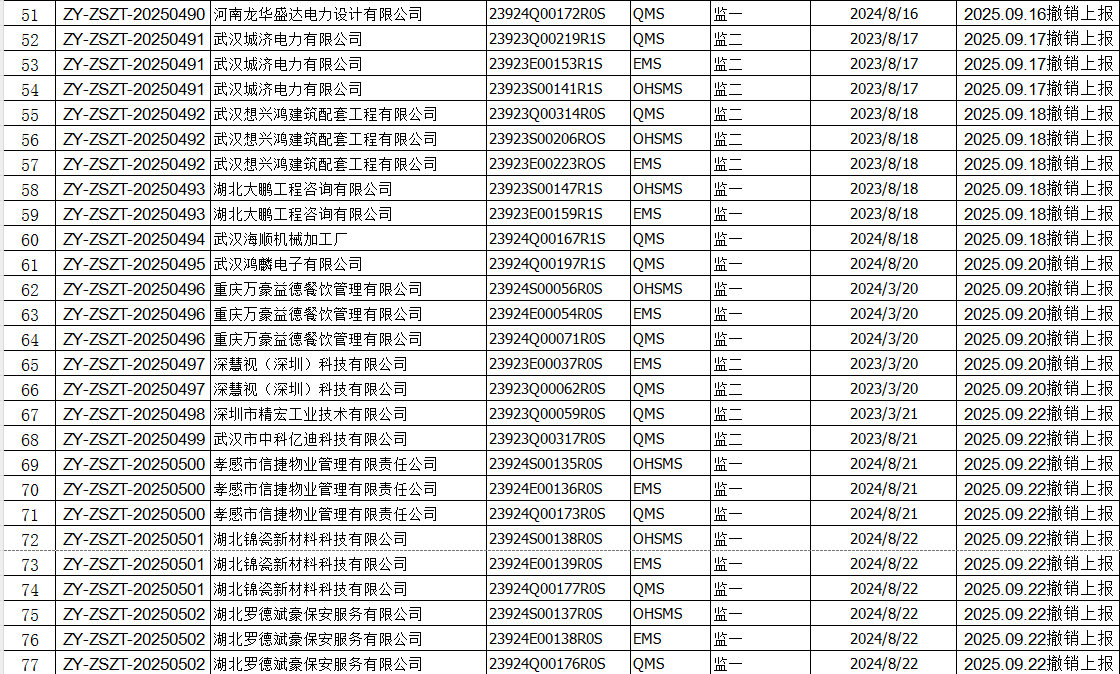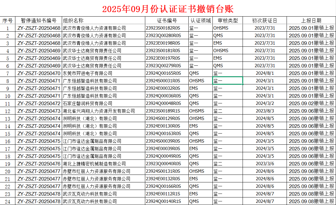 2025年09月份认证证书撤销名单