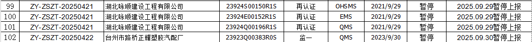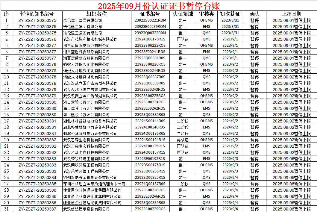 2025年09月份认证证书暂停名单